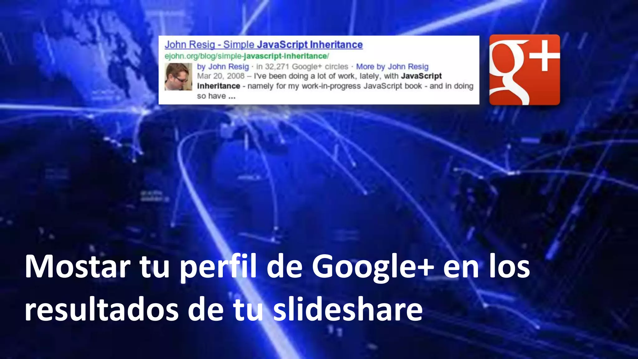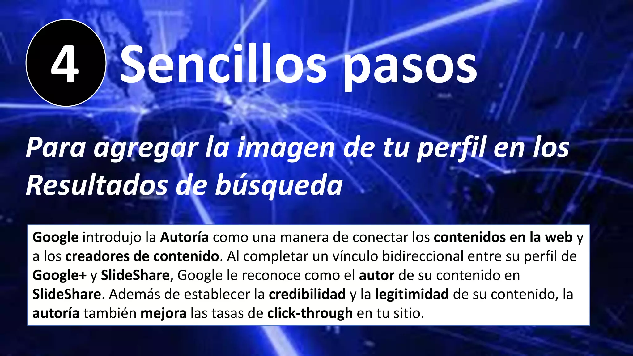 Este documento proporciona instrucciones en 4 pasos para vincular un perfil de Google+ con una cuenta de SlideShare para que la imagen de perfil aparezca en los resultados de búsqueda de SlideShare. Los pasos incluyen ir a la configuración de cuenta de SlideShare, vincular las cuentas de SlideShare y Google+, editar la sección "Contributor to" en el perfil de Google+, y agregar la URL de SlideShare. Al completar estos pasos, la imagen de perfil de Google+ aparecerá junto con los resultados de Slide