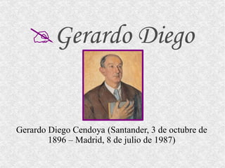 Gerardo Diego fue un destacado poeta español perteneciente a la Generación del 27. Nació en 1896 en Santander y fue catedrático de Lengua y Literatura. Fue uno de los principales seguidores de la vanguardia poética española como el Ultraísmo y el Creacionismo. Algunas de sus obras más importantes incluyen poemas como "Ayer soñaba", "Por qué cuando te hablo" y "Peña Cabarga".