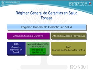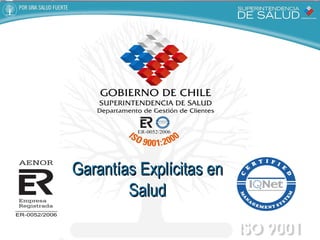 Las Garantías Explícitas en Salud (GES) establecen un conjunto de prestaciones de salud a las que tienen derecho los beneficiarios de Fonasa e Isapres. Las GES incluyen el acceso oportuno y de calidad a problemas de salud priorizados, protección financiera a través de copagos limitados y plazos para el otorgamiento de prestaciones. Las personas pueden reclamar ante su asegurador o la Superintendencia de Salud en caso de incumplimiento de las GES.