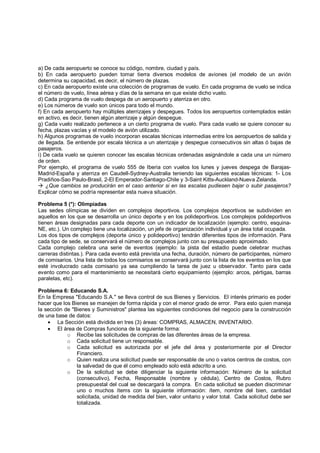 Este documento presenta 6 problemas de modelado entidad-relación para diferentes dominios, incluyendo una empresa de ventas, un sistema de transporte de carreteras, un sistema de vuelos y las olimpíadas. Proporciona detalles sobre las entidades, atributos e interrelaciones relevantes para cada uno y pide crear diagramas entidad-relación para representar la información dada.