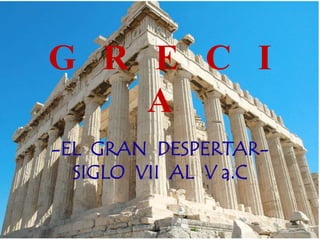 El documento resume la evolución del arte griego desde el siglo VII al I a.C., destacando tres periodos principales: el arcaico, donde se buscó establecer un estilo propio; el clásico, que alcanzó la perfección técnica y naturalismo; y el helenístico, con un estilo más monumental y realista. La escultura griega se enfocó en exaltar la figura humana, mientras la pintura, aunque menos conocida, logró avances como el escorzo.