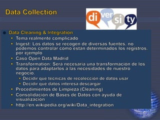 Este documento presenta información sobre Victoria López de la Universidad Complutense de Madrid y su trabajo en nuevas tecnologías sociales y datos abiertos. También menciona diversos formatos de datos como imágenes, video y audio y temas relacionados con marcas, códigos postales y distribuidores.