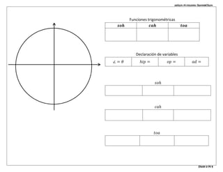 El documento presenta una guía sobre las gráficas de funciones trigonométricas, incluyendo la definición y ubicaciones de puntos en el círculo unitario, así como las relaciones entre grados y radianes. Se detallan las funciones seno, coseno, tangente, cotangente, secante y cosecante, junto con sus respectivos dominios y rangos. Además, se incluyen ejemplos de valores de ángulos específicos y sus relaciones trigonométricas.