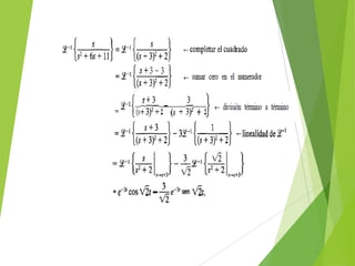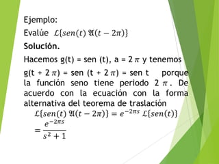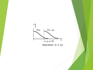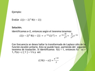 El documento presenta información sobre la transformada de Laplace. Introduce el primer teorema de traslación, el cual establece que la transformada de Laplace de una función desplazada en el eje de tiempo es igual a la transformada de la función original evaluada en una variable desplazada. También presenta demostraciones de este teorema y ejemplos de su aplicación.