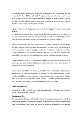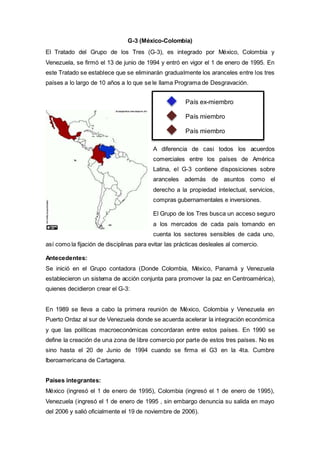 El Tratado del Grupo de los Tres (G-3) es un acuerdo comercial firmado en 1994 entre México, Colombia y Venezuela para eliminar gradualmente los aranceles entre los países a lo largo de 10 años. A diferencia de otros acuerdos comerciales latinoamericanos, el G-3 también incluye disposiciones sobre derechos de propiedad intelectual, servicios, compras gubernamentales e inversiones. Venezuela se retiró del acuerdo en 2006 al concentrarse en su entrada al MERCOSUR.