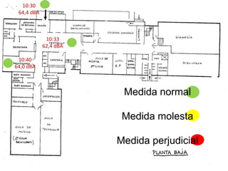 El documento presenta los resultados de varias mediciones de niveles de sonido realizadas por estudiantes de 2oA. Se muestran datos de niveles de sonido medidos a diferentes horas del día, así como los picos máximos y mínimos registrados.