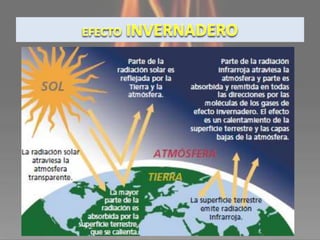 El documento habla sobre el calentamiento global y sus causas principales como la quema de combustibles fósiles y las emisiones de gases de efecto invernadero por la agricultura y el ganado. También describe algunos de los impactos del calentamiento global como el derretimiento de glaciares, olas de calor y tormentas más intensas. Finalmente, presenta algunas medidas para reducir las emisiones a través de protocolos y convenciones internacionales.