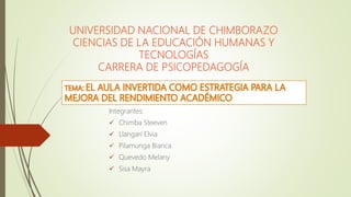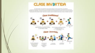 Este documento presenta información sobre el modelo de aula invertida. Describe las características del modelo, incluyendo que los estudiantes ven material de instrucción en casa y completan actividades en el aula con la guía del profesor. También discute los roles del profesor y los estudiantes, estrategias para implementar el modelo de manera virtual, y las ventajas del modelo para mejorar el rendimiento académico.