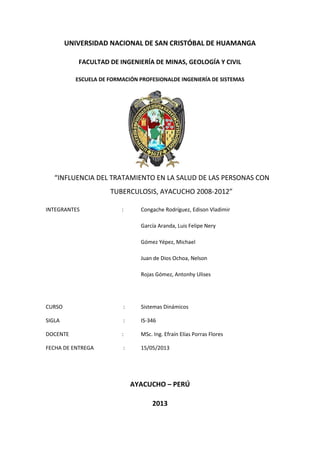 Este documento describe una investigación sobre la influencia del tratamiento en la salud de las personas con tuberculosis en el departamento de Ayacucho, Perú entre 2008 y 2012. El objetivo general fue desarrollar un tratamiento adecuado que mejore la salud de los pacientes con tuberculosis mediante el uso de la dinámica de sistemas. Se revisó literatura sobre la tuberculosis en Perú y la estrategia nacional para el control de la enfermedad. La investigación se delimitó a la ciudad de Ayacucho y utilizó datos de hospitales locales.
