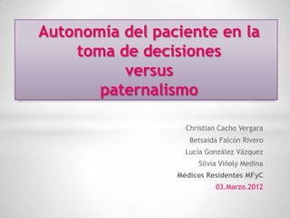 Este documento discute el principio de autonomía del paciente versus el paternalismo médico. Define estos conceptos y explora su evolución histórica, con un enfoque en cómo la autonomía del paciente ha ganado importancia sobre el tiempo. También examina las implicaciones del principio de autonomía para la medicina familiar y comunitaria, incluyendo el respeto a las preferencias del paciente y los límites cuando el no hacer daño está en juego. Finalmente, presenta un caso clínico sobre el consentimiento de una paciente menor de edad.