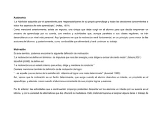 El documento describe cómo la mediateca del CCH Naucalpan puede promover el aprendizaje autónomo del inglés entre los estudiantes. Propone tres actividades en clase que motivarían a los estudiantes a visitar la mediateca para apoyar su aprendizaje, desarrollando su autonomía y motivación. Las actividades incluyen identificar objetivos de aprendizaje, comparar progreso en habilidades específicas, y crear una revista colaborativa utilizando recursos de la mediateca.