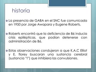 El GABA fue descubierto en 1950 y se identificó que inhibe las convulsiones. En 1970 se identificaron los receptores GABA A y GABA B. Más tarde se descubrió el receptor GABA C. El GABA se sintetiza y degrada en el cerebro y la médula espinal. Los receptores GABA A se localizan principalmente en las sinapsis mientras que los receptores GABA B se encuentran a lo largo de sitios extrasinápticos. El GABA tiene funciones como relajar las fibras musculares y inhibir la sobreexcitación nerv