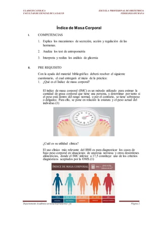 Este documento presenta tres prácticas de laboratorio sobre el índice de masa corporal, el sistema reproductor femenino y el sistema reproductor masculino. En la primera práctica, los estudiantes miden su peso, talla e índice de masa corporal y clasifican su estado nutricional. En la segunda práctica, los estudiantes deben responder preguntas sobre la fisiología de las hormonas sexuales femeninas. La tercera práctica implica el sistema reproductor masculino, aunque no se proporcionan detalles