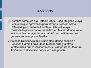 Gabriel Celaya fue un poeta español nacido en Bilbao en 1920. Se mudó a Madrid para estudiar ingeniería pero se inclinó hacia la literatura al conocer a otros intelectuales. Escribió poesía social con un estilo sencillo y prosaico para denunciar injusticias. Fue un autor prolífico que encontró su voz con libros como "Movimientos elementales" y "Tranquilamente hablando". El poema muestra la importancia de vivir plenamente pero también de prepararse para la muerte.