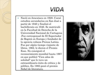 Gabriel García Márquez nació en 1928 en Colombia. Estudió derecho en la universidad pero también trabajó como periodista y vendedor de libros. En 1962 ganó el Premio Esso por su trabajo literario. Sin embargo, no alcanzó reconocimiento mundial hasta 1967 con la publicación de Cien Años de Soledad, por la que ganó el Premio Nobel de Literatura en 1982. Algunas de sus obras más conocidas incluyen El Amor en los Tiempos del Cólera y Crónica de una Muerte Anunciada.