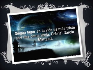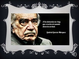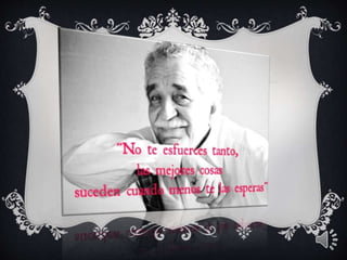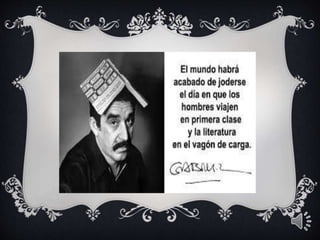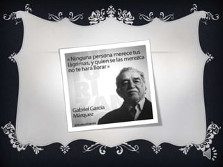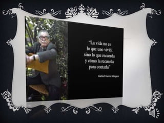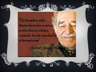 El documento proporciona información biográfica básica sobre el escritor colombiano Gabriel García Márquez, incluyendo su lugar y fecha de nacimiento, sus obras más destacadas como Cien Años de Soledad, y una breve mención de algunos de sus cuentos.