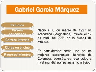 Gabriel García Márquez nació en Colombia en 1927 y fue uno de los escritores más importantes del siglo XX. Estudió derecho pero se dedicó al periodismo y la literatura. Su obra maestra fue Cien Años de Soledad, publicada en 1967, que lo convirtió en una figura emblemática de la literatura latinoamericana y le valió el Premio Nobel de Literatura en 1982.