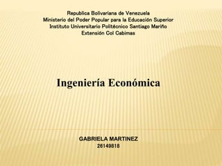 El documento es un registro de una estudiante de la República Bolivariana de Venezuela en el Instituto Universitario Politécnico Santiago Mariño en la ciudad de Col Cabimas. La estudiante se llama Gabriela Martínez y su número de identificación es 26149818. Está estudiando Ingeniería Económica.