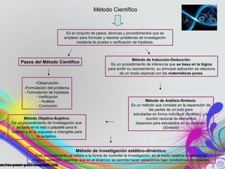 El documento presenta los fundamentos del método científico, incluyendo sus pasos, conceptos y diferentes métodos de investigación. Se distinguen tipos de conocimiento, como el vulgar y el científico, y se define la ciencia como un conjunto de conocimientos organizados y verificables. Además, se describen características y tipos de ciencias, diferenciando entre las formales y fácticas.