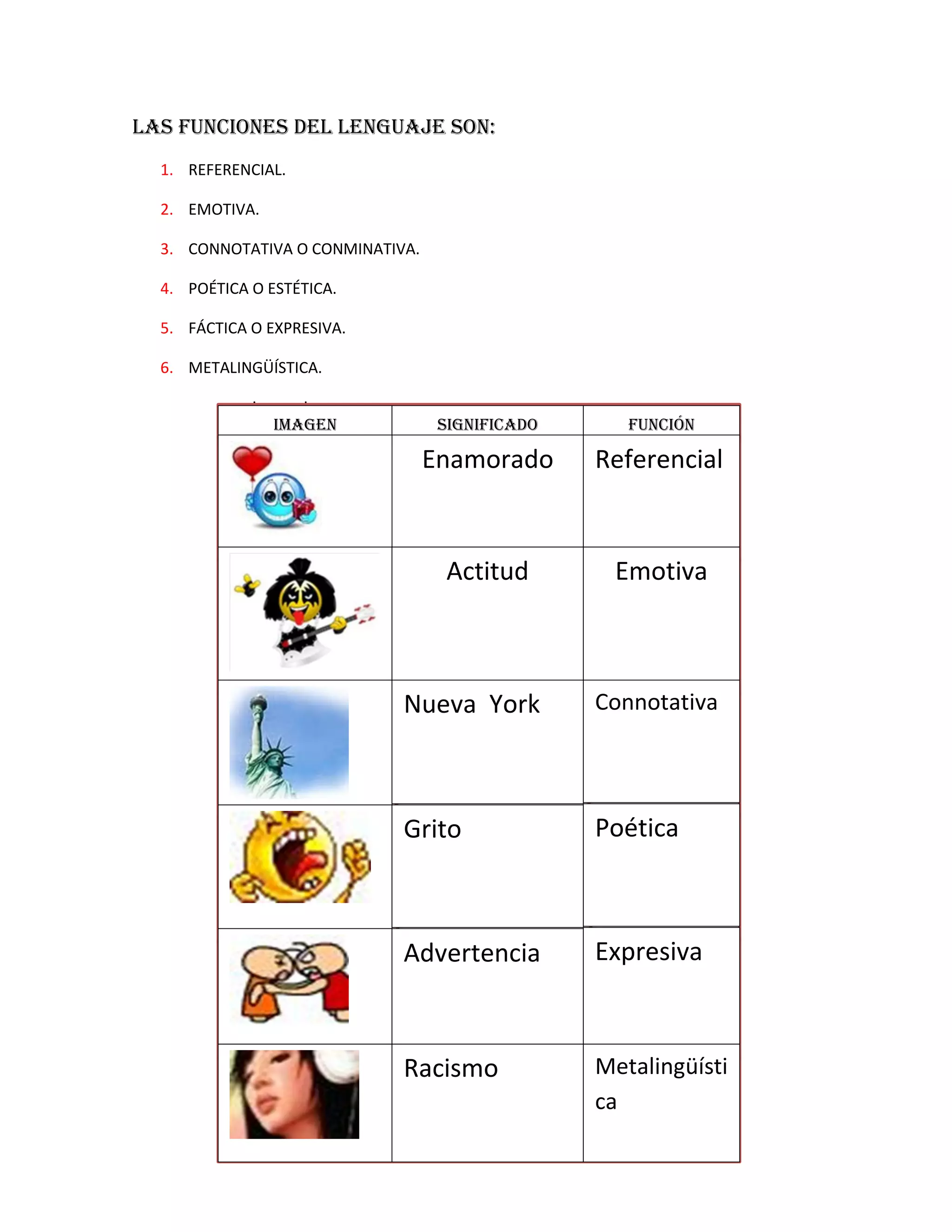 El documento enumera seis funciones del lenguaje: referencial, emotiva, connotativa o conminativa, poética o estética, fática o expresiva y metalingüística. Además, presenta una tabla con ejemplos de imágenes y sus significados y funciones correspondientes como "Enamorado" con función referencial o "Grito" con función poética.