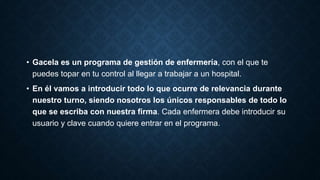 Gacela es un programa de gestión de enfermería que reemplaza el soporte papel para registrar procesos de enfermería, mejorando la seguridad clínica y los servicios asistenciales. Permite llevar un control informatizado de los cuidados de los pacientes, incluyendo un mapa de camas virtual y registros de balances hídricos. El software también proporciona herramientas para realizar gráficas de constantes vitales y gestionar la agenda de cuidados del paciente.