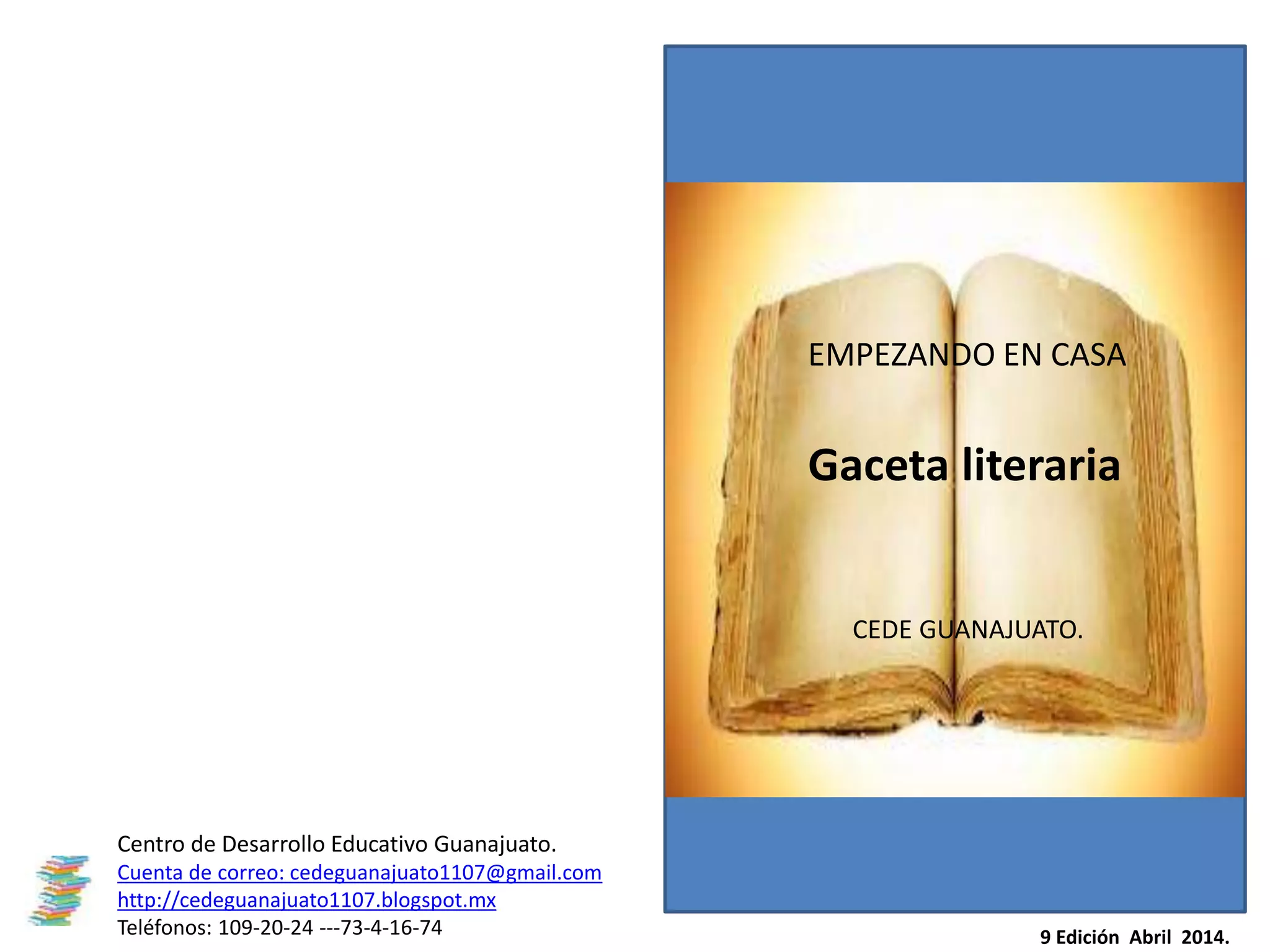 Este documento presenta un resumen de una revista literaria mensual producida por el Centro de Desarrollo Educativo Guanajuato. La revista incluye secciones sobre efemérides, personajes del mes, literatura, educación, ciencia y tecnología, medio ambiente, artes, educación física y más. También presenta cuentos, poemas y biografías de colaboradores y autores.