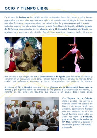 Este documento resume las actividades y noticias de enero de 2012 de la Fundación Magdalena. Incluye un editorial sobre el fallecimiento de dos personas queridas en 2011 y la necesidad de recuperar la alegría y la ilusión. También resume las actividades de ocio y tiempo libre de diciembre, incluyendo visitas y celebraciones. Finalmente, da el pésame por el fallecimiento de dos mujeres asociadas a la fundación y agradece el apoyo de varias organizaciones.