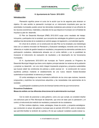 El documento presenta el Plan de Desarrollo Municipal 2012-2015 de Tizimín, Yucatán. Resume el marco normativo de la planeación a nivel federal, estatal y municipal. Explica que el plan fue desarrollado de manera participativa e incluyente considerando las necesidades y demandas de la ciudadanía. Su objetivo principal es atender las demandas de la población y promover el desarrollo de manera sustentable mediante programas e inversiones que reduzcan la pobreza y mejoren la calidad de vida.