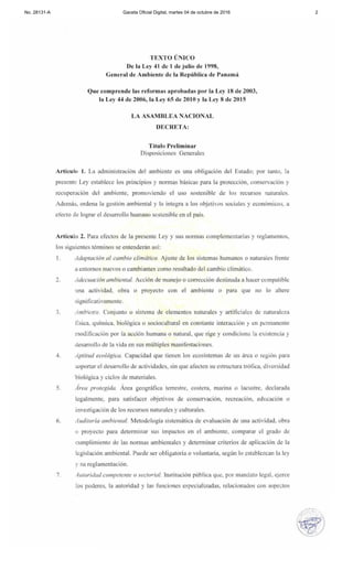 Este documento presenta un resumen del Texto Único de la Ley General de Ambiente de Panamá, la cual establece los principios y normas básicas para la protección del ambiente y el desarrollo sostenible. Incluye definiciones de términos clave relacionados con la gestión ambiental, como contaminación, áreas protegidas, cambio climático, conservación, y créditos ambientales canjeables. Además, menciona decretos del Consejo de Gabinete sobre la autorización para incrementar el registro de valores de Pan