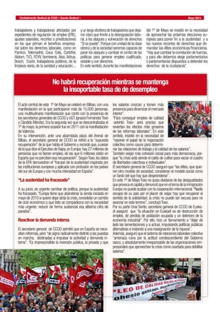Decenas de miles de personas participaron en más de 70 manifestaciones el 1 de mayo para exigir el fin de las políticas de austeridad y los recortes. Los sindicatos CCOO y UGT organizaron las protestas para denunciar que el crecimiento económico actual no está mejorando las condiciones de vida de los ciudadanos ni generando empleo de calidad. El secretario general de CCOO criticó que la austeridad ha fracasado y que es necesario un cambio de políticas para reactivar la demanda interna y reducir la alta tasa de desempleo