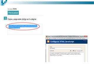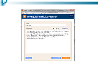 Este documento explica qué son los gadgets y widgets, y cómo insertarlos en un blog. Define un gadget como un pequeño dispositivo con una función específica, y un widget como una pequeña aplicación que provee acceso rápido a funciones comunes y provee información visual. Explica que para insertar un gadget en un blog se accede a la pestaña de diseño, se selecciona "Añadir un gadget", y se pega el código del gadget deseado. Proporciona enlaces para conseguir códigos de gadgets como relojes, calculador