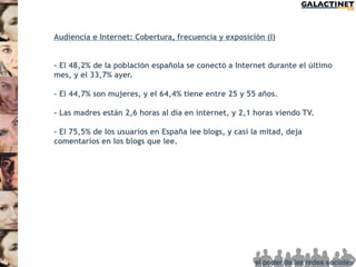 El 48,2% de la población española se conectó a internet en el último mes, destacando el uso activo de blogs y redes sociales, especialmente entre mujeres y madres. Los estudios indican que estos grupos son decisores de compra y comparten activamente recomendaciones de productos en sus círculos. Galactinet ha diseñado redes de blogs segmentadas para influir efectivamente en audiencias específicas a través de formatos publicitarios adaptados.