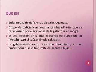 La galactosemia es un trastorno hereditario del metabolismo que causa una deficiencia en la enzima galactoquinasa, lo que impide que el cuerpo procese la galactosa. Los síntomas incluyen ictericia, vómitos, convulsiones e hipoglucemia en los recién nacidos. El tratamiento consiste en una dieta estricta libre de galactosa de por vida. Aunque el pronóstico es mejor con un diagnóstico y tratamiento tempranos, algunos pacientes pueden presentar retraso intelectual u otras complicaciones.