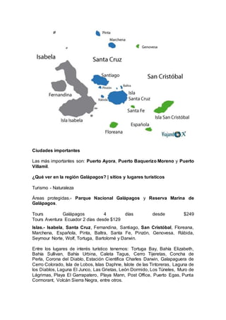 Las Islas Galápagos son un archipiélago ecuatoriano ubicado en el Océano Pacífico, a 1000 km de la costa de Ecuador. La región está formada por 13 grandes islas, 9 pequeñas islas y más de 100 islotes, y es conocida por su gran biodiversidad de flora y fauna endémica, así como por haber inspirado la teoría de la evolución de Darwin. Las Islas Galápagos albergan numerosas especies únicas como tortugas gigantes, pingüinos, iguanas y cormor