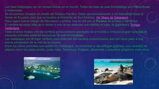 Las Islas Galápagos son un archipiélago ecuatoriano único ubicado en el Océano Pacífico, hogar de muchas especies endémicas de animales y plantas. Las islas son conocidas por su diversidad de vida silvestre, incluyendo tortugas gigantes, pingüinos, iguanas y más. También son un destino popular para el turismo de naturaleza y la investigación científica.