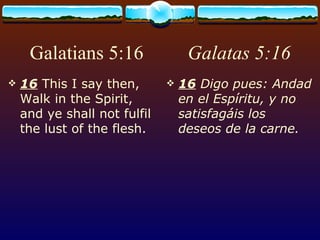 El documento contrasta las obras de la carne con el fruto del Espíritu según la Biblia. Las obras de la carne como la inmoralidad, idolatría y enemistad conducen a una vida de tormenta sin paz ni satisfacción, mientras que el fruto del Espíritu como el amor, gozo y paz ofrecen la vida que se busca. El documento enfatiza que los lectores deben decidir seguir a Cristo y su Espíritu en lugar de sus propios deseos carnales.