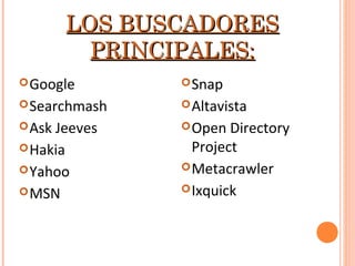 Este documento describe los principales buscadores de Internet como Google, Yahoo y MSN. Google fue fundado en 1998 por Larry Page y Sergey Brin y rápidamente superó en popularidad a su competidor AltaVista. Yahoo fue fundado en 1994 por Jerry Yang y David Filo como un directorio web y ahora ofrece servicios como correo electrónico y noticias. En 2008, Google y Yahoo firmaron un acuerdo por el cual Google proporcionaría publicidad en los resultados de búsqueda de Yahoo.
