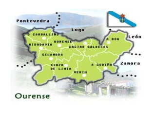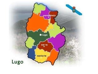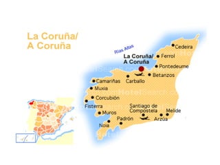 Este documento resume información sobre diversos lugares de interés turístico y cultural en Galicia, incluyendo parques nacionales, playas, cascadas, castillos, catedrales, monasterios y otros sitios históricos y paisajes notables de la región.