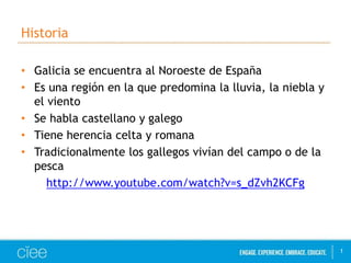 Galicia se encuentra al noroeste de España, es una región con clima lluvioso donde se habla castellano y galego. Tradicionalmente la gente se dedicaba a la agricultura y la pesca, cultivando verduras como col, grelos y patatas e capturando mariscos como el pulpo, percebes y mejillones. Un plato típico de Galicia es la empanada, un pan relleno de verdura, pescado o carne.