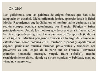 El documento explica que los galicismos son palabras de origen francés que se han incorporado al español a lo largo de los siglos, especialmente desde la Edad Media. Menciona algunos ejemplos como "homenaje", "mensaje" y "vergel". Explica que existen tres tipos de galicismos: léxico, semántico y de calco semántico. Finalmente, proporciona más ejemplos actuales de galicismos como "amateur", "bulevar" y "chef".