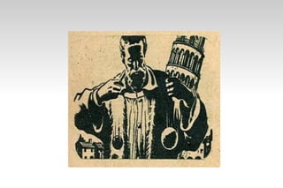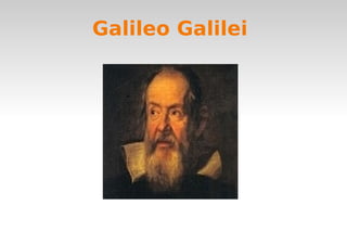 Galileo Galilei fue un astrónomo, físico y matemático italiano del siglo XVI que hizo contribuciones fundamentales a la astronomía y la física. Mejoró el telescopio y descubrió los cuatro satélites principales de Júpiter. Realizó experimentos sobre el movimiento que llevaron a la primera ley del movimiento y apoyó la teoría heliocéntrica de Copérnico a pesar de la oposición de la Iglesia. También inventó instrumentos como el termómetro y el compás geomé