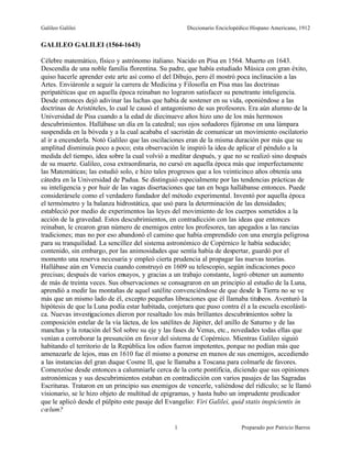 Galileo Galilei fue un célebre matemático, físico y astrónomo italiano nacido en 1564. Realizó importantes descubrimientos científicos a través de la observación experimental, como las leyes del movimiento, el telescopio y las lunas de Júpiter. Sin embargo, su defensa del sistema heliocéntrico de Copérnico le causó problemas con la Iglesia católica, que lo condenó por herejía y lo obligó a retractarse públicamente. A pesar de esto, sus descubrimientos tuvieron un