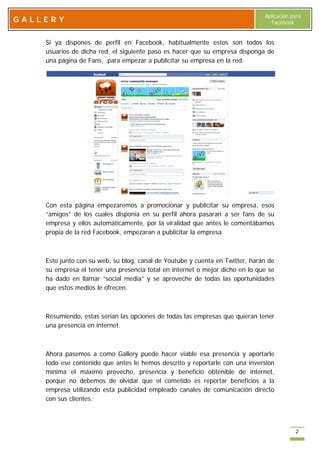 La aplicación Gallery para Facebook permite a las galerías de arte promocionar sus servicios y artistas a través de la red social, aprovechando la viralidad de Facebook para que los usuarios que instalen la aplicación la recomienden a sus amigos. La aplicación ofrece valores añadidos a los clientes y una comunicación constante entre la galería y sus usuarios/clientes. Gallery ayuda a las galerías a tener una fuerte presencia en internet a través de redes sociales y otros canales digitales con una inversión mínima.