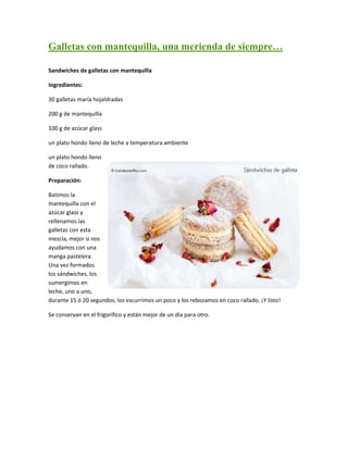 Este documento presenta una receta para hacer galletas con mantequilla. La receta incluye unir mantequilla y azúcar glass para rellenar galletas maría hojaldradas. Luego, los sándwiches de galletas se sumergen en leche y se rebozan en coco rallado antes de servirse. La merienda se conserva en el refrigerador y mejora su sabor al día siguiente.