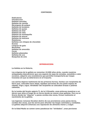 El documento presenta una introducción sobre el origen y evolución histórica de las galletas, desde sus inicios hace 10,000 años hasta su popularidad actual. Luego incluye más de 20 recetas de diferentes tipos de galletas dulces, como galletas sencillas, de vainilla, merengues de pulque, de levadura, queso, miel, mantequilla, azúcar, maicena y más. Finaliza agradeciendo a los lectores y deseando que disfruten preparando estas recetas caseras.