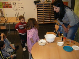 Niños ayudaron a hacer galletas de mantequilla poniendo harina, azúcar, vainilla y canela en polvo en la masa y amasándola todos juntos. Luego usaron un rodillo para aplanar la masa y moldes de varias formas para hacer las galletas antes de hornearlas y llevarse cada uno tres galletas a casa.