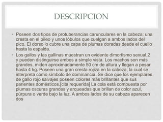 hasta 4 kg. Poseen una gran cresta rojiza en la cabeza, la cual se