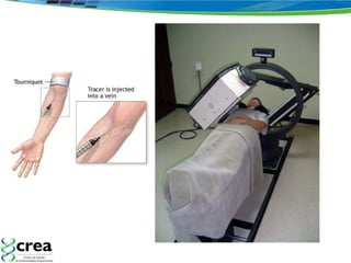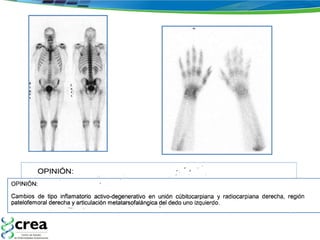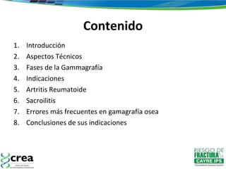 El documento habla sobre la gamagrafía ósea, una exploración de medicina nuclear que proporciona imágenes funcionales del metabolismo óseo. Explica las indicaciones, técnicas y fases de la gamagrafía, incluyendo su uso para detectar enfermedades óseas malignas y benignas, artritis reumatoide, y sacroilitis. También discute nuevas técnicas como SPECT y PET que pueden proporcionar mayor especificidad.