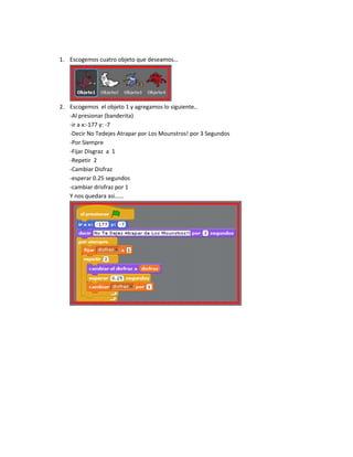 Este documento presenta instrucciones para crear un juego simple en el que cuatro objetos se mueven al presionar banderas y teclas de dirección. Se explica cómo agregar comandos a cada objeto para que digan frases, cambien de disfraz, se muevan y respondan al color negro al presionar banderas o teclas. El objetivo es que los estudiantes puedan diseñar y jugar su propio juego siguiendo estas instrucciones paso a paso.