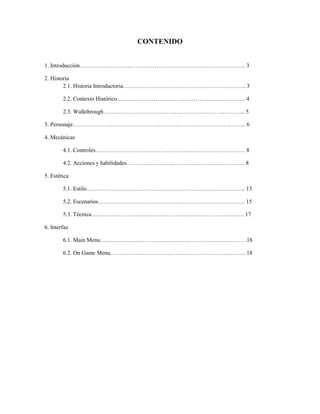 El documento presenta una descripción general del diseño de un videojuego llamado "Ságipa, el último Zipa". Se describe la historia del juego, el personaje principal Ságipa, las mecánicas de juego que incluyen controles y acciones, la estética inspirada en el estilo steampunk, y los escenarios que comprenden diferentes niveles como El Dorado y un desierto.